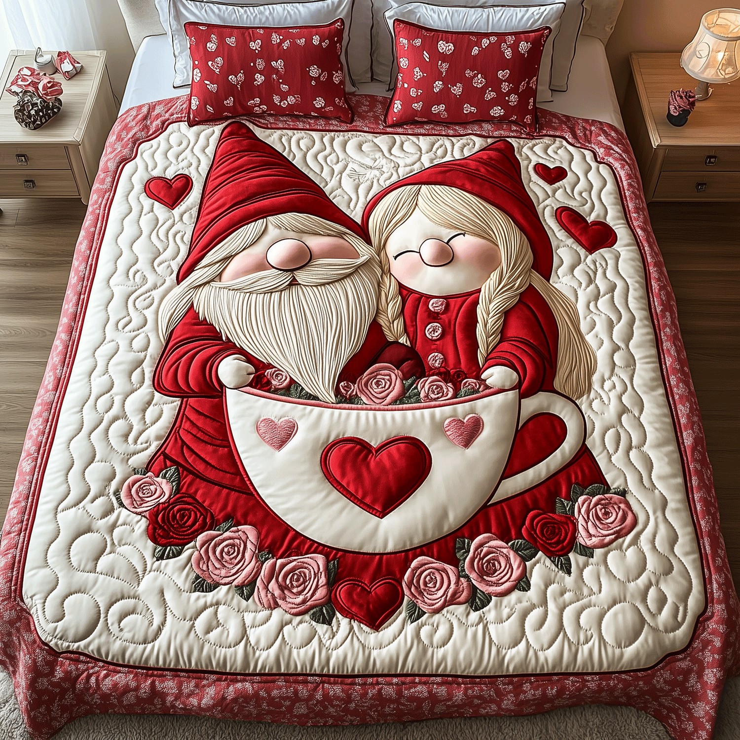 Rushgleam Rustic Romance Gnome Quilted Bedding Set Couple Valentine Room Decor Ideas Gift For Her