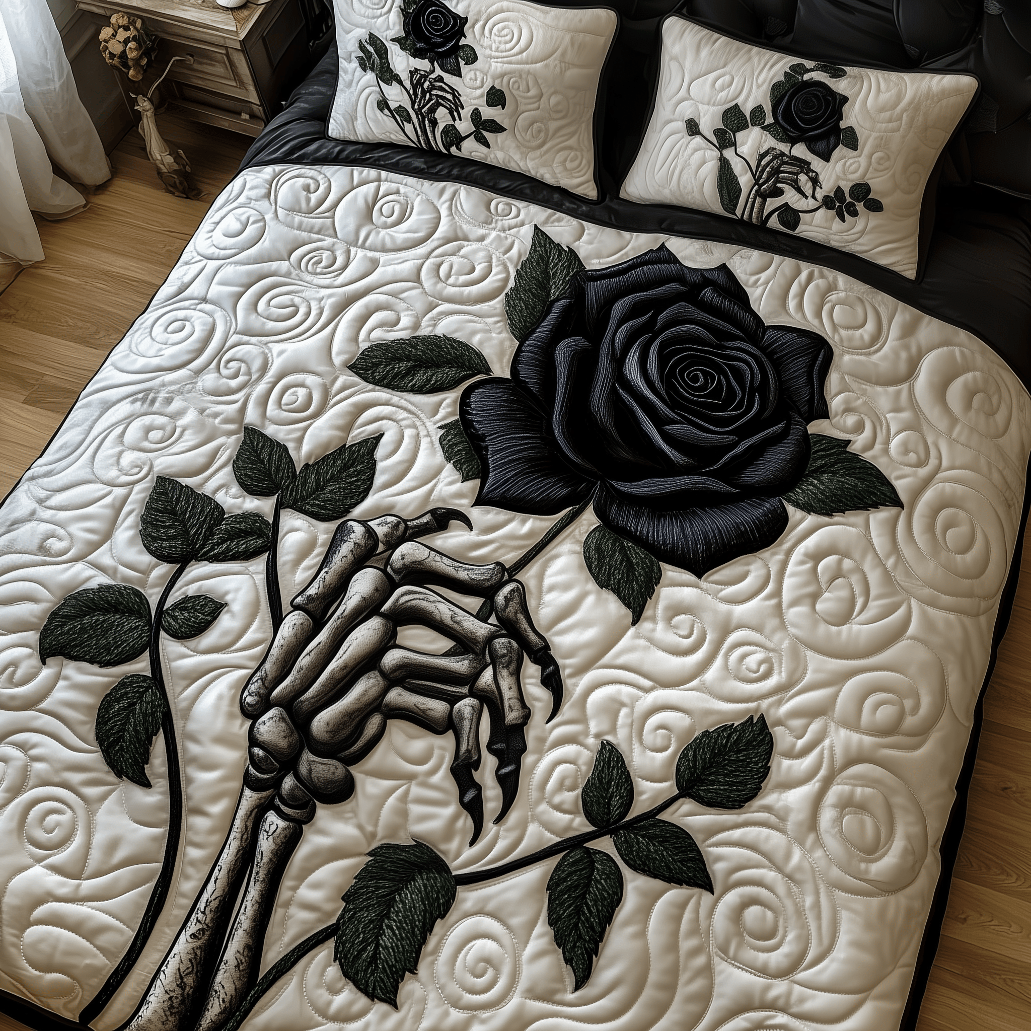 Rushgleam Skeleton Black Rose Quilted Bedding Set Black Themed Bedspread Set Valentine Day Man Gift