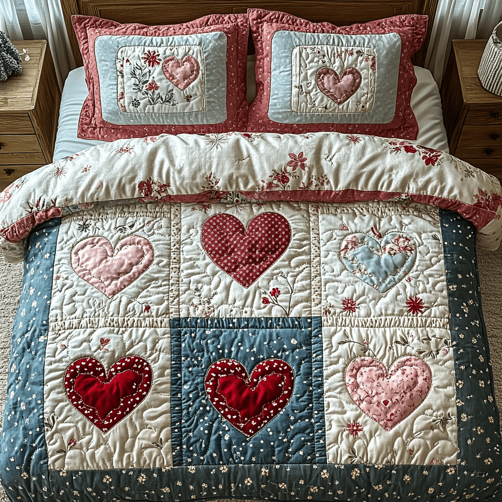 Rustic Bloom Heart Quilted Bedding Set Cute Bedroom Decor Sweet Heart Gift For Her