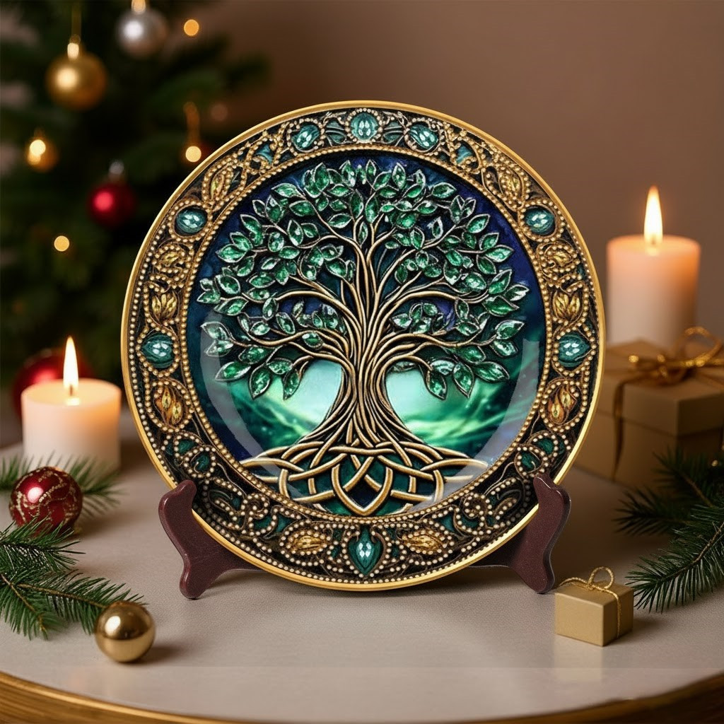 Tree Of Life With Green Gem Leaves Christmas Ceramic Plate Xmas Holiday Spiritual Gifts