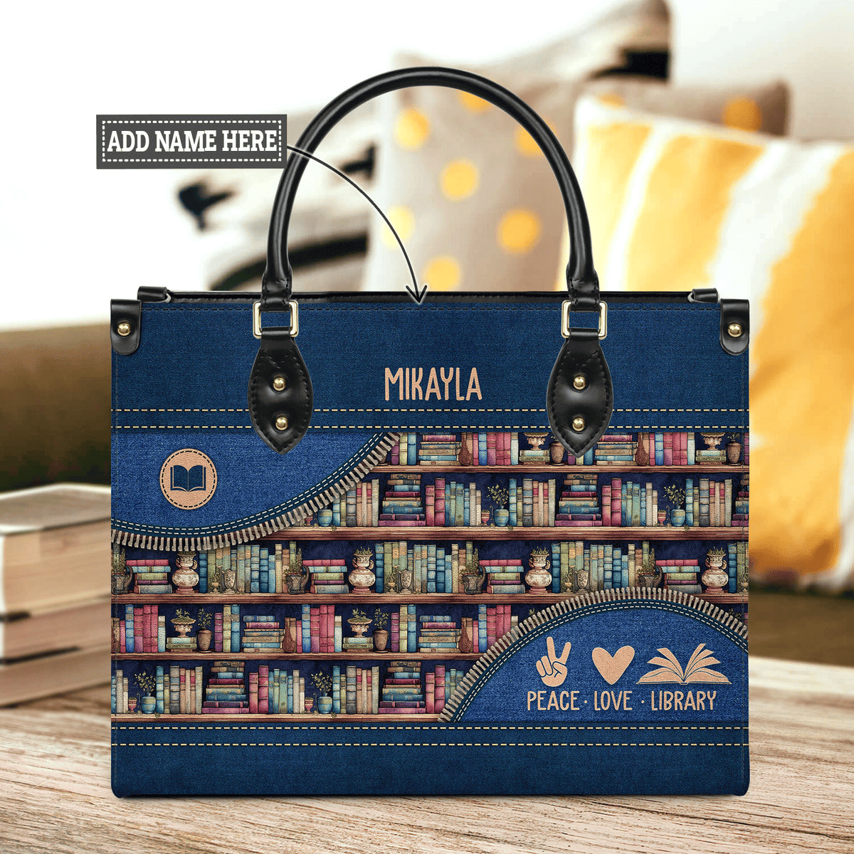 Custom Name Peace Love Library Leather Bag Best Gift for Bookworm