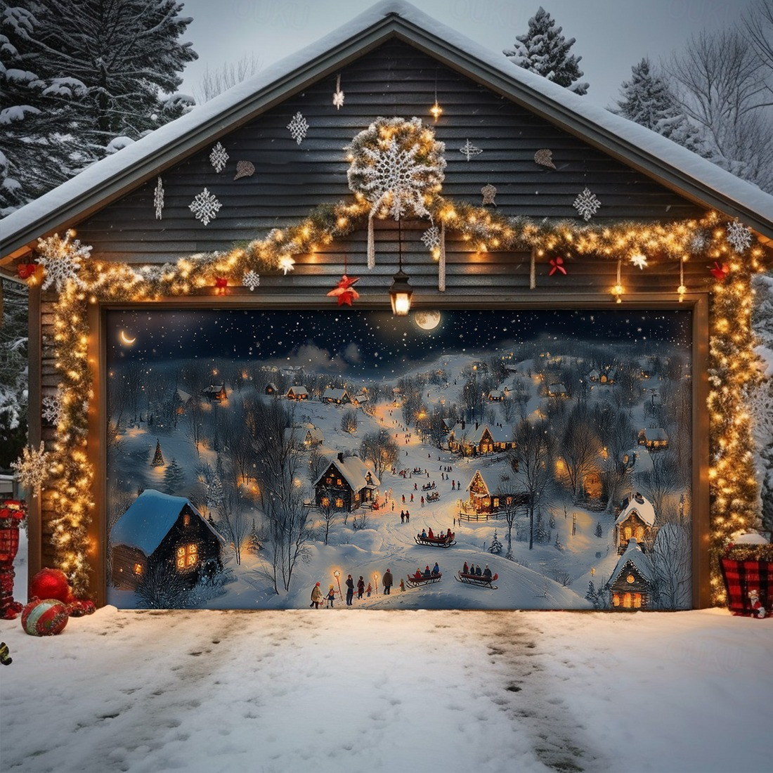 Rushgleam Moonlit Village Cheer Christmas Garage Door Cover Winter Outside Decor Holiday Gifts