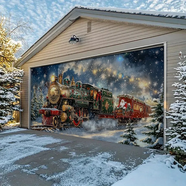 Rushgleam Santa’s Sleigh On Rails Christmas Garage Door Cover Enchanted Railway Scene Holiday Decoration