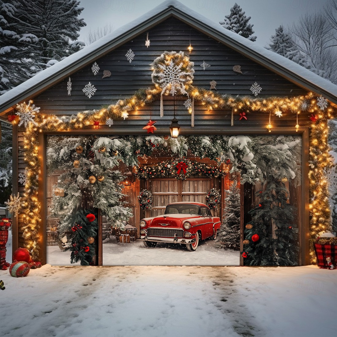 Rushgleam Scarlet Drive Christmas Garage Door Cover Red Car In Snowy Garage Outdoor Gift Ideas