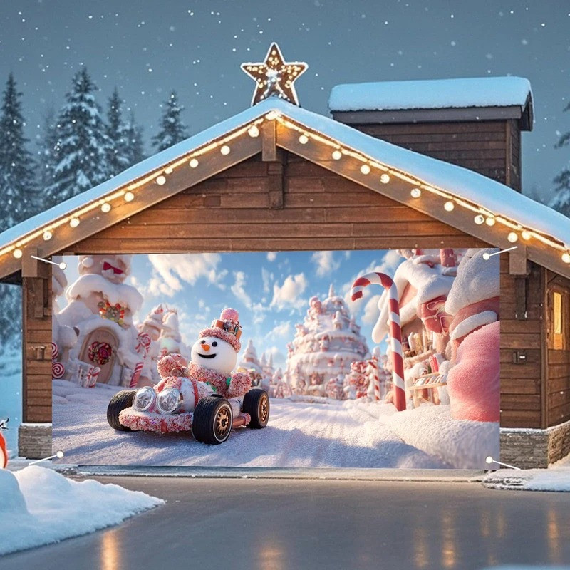 Snowman Driving Town Merry Christmas Garage Door Cover Best Door Banner Decor Gifts