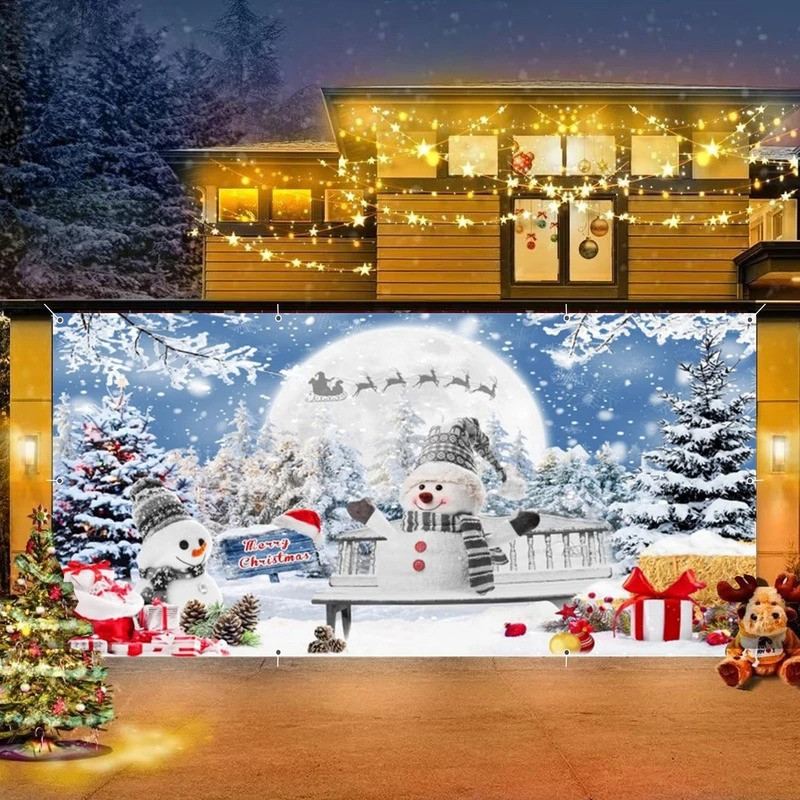 Snowman Night Merry Christmas Garage Door Cover Winter Outdoor Decoration Snow Gifts