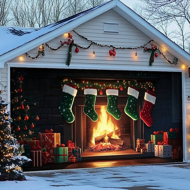 Fireplace With Socks Hanging Christmas Garage Door Cover Xmas Cozy Outdoor Decor Gifts