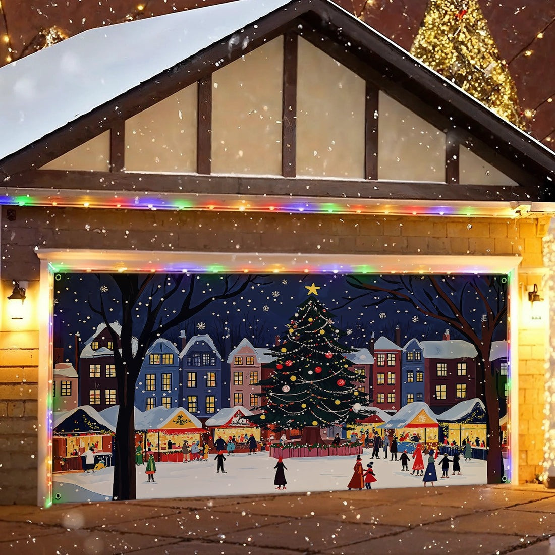 Rushgleam Christmas Market Garage Door Cover Winter Village Scene Outdoor Holiday Decoration