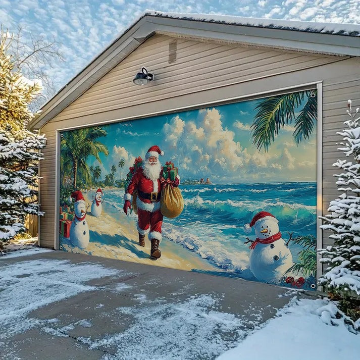 Rushgleam Christmas Santa’s Beachside Garage Door Cover Santa With Snowman At Ocean Home Decor Gifts