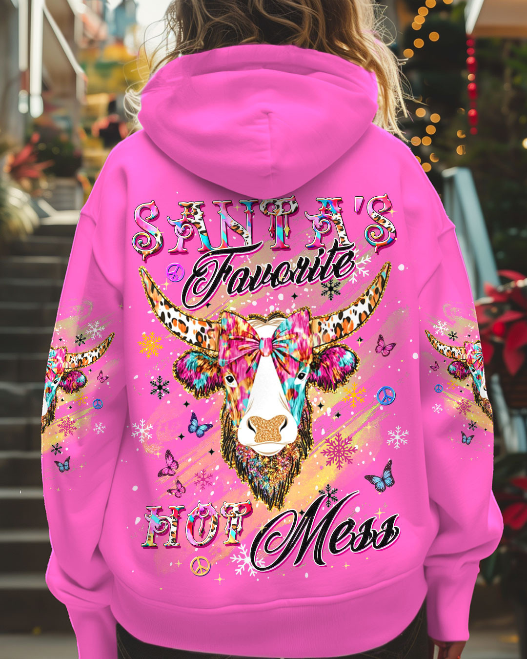 Rushgleam Highland Cow Santa’s Favorite Hot Mess Christmas Hoodie Xmas Clothing Highland Cow Gifts