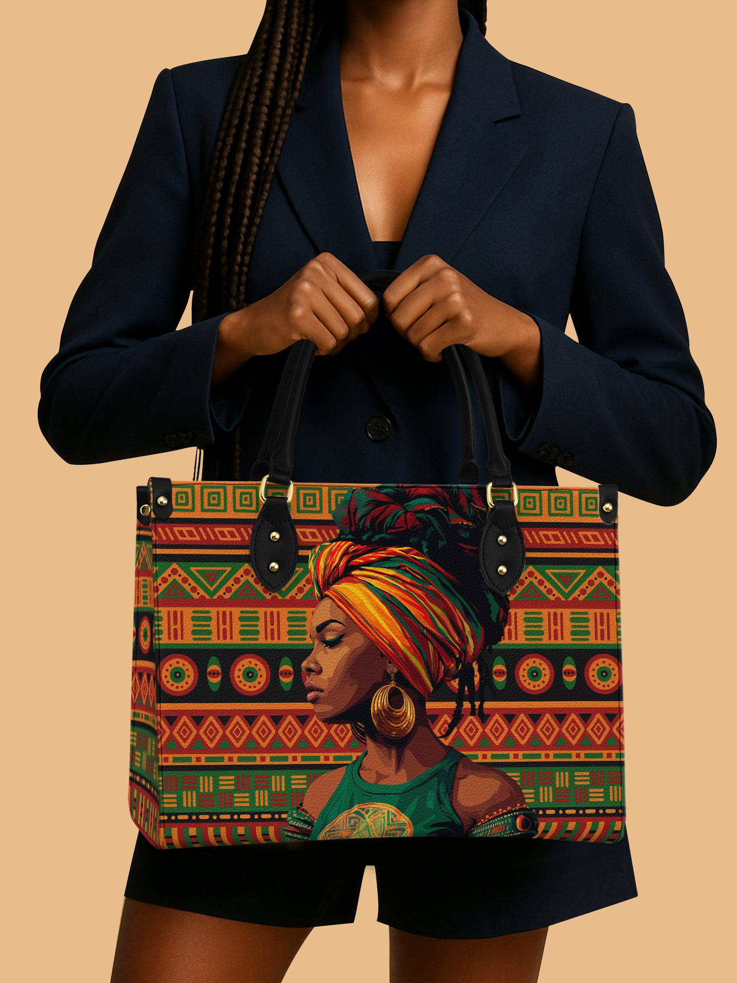 $59.99 – $99.99Price range: $59.99 through $99.99Rushgleam Kente Soul Premium Leather Handbag Black Woman In Vibrant Headwrap Present For Mom