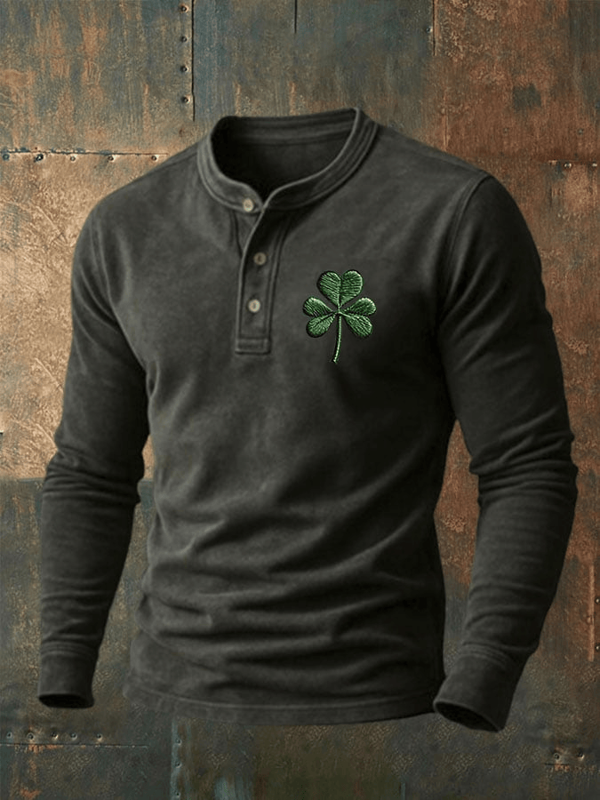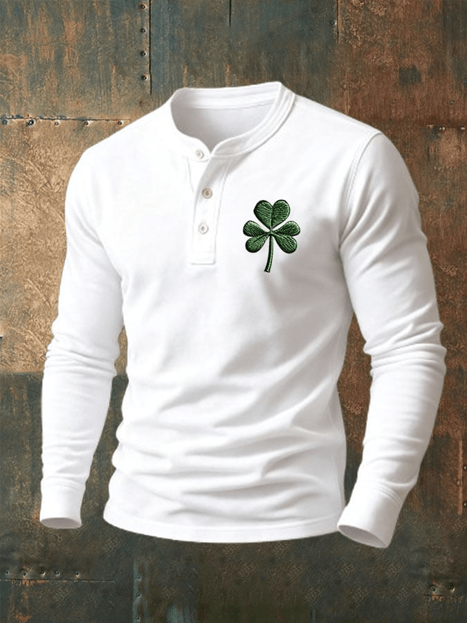 Men’s Vintage St. Patrick’s Day Henley Neck Shirt Clover Leaf Print Shirt Gift for Him