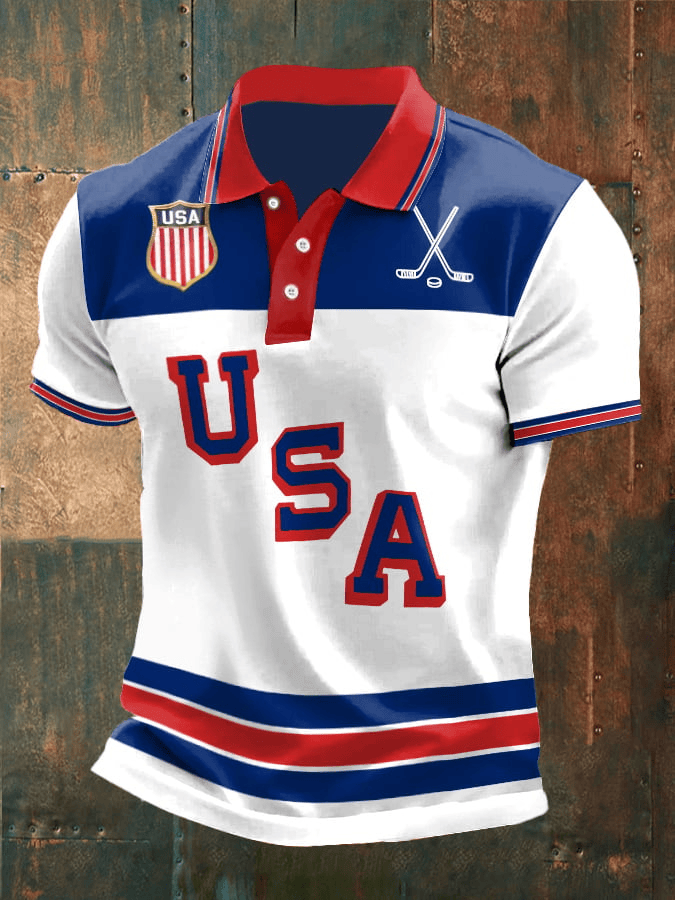 $31.95 – $36.95Price range: $31.95 through $36.95Men’s Vintage USA Ice Hockey Printed Polo Shirt Game Day Outfit