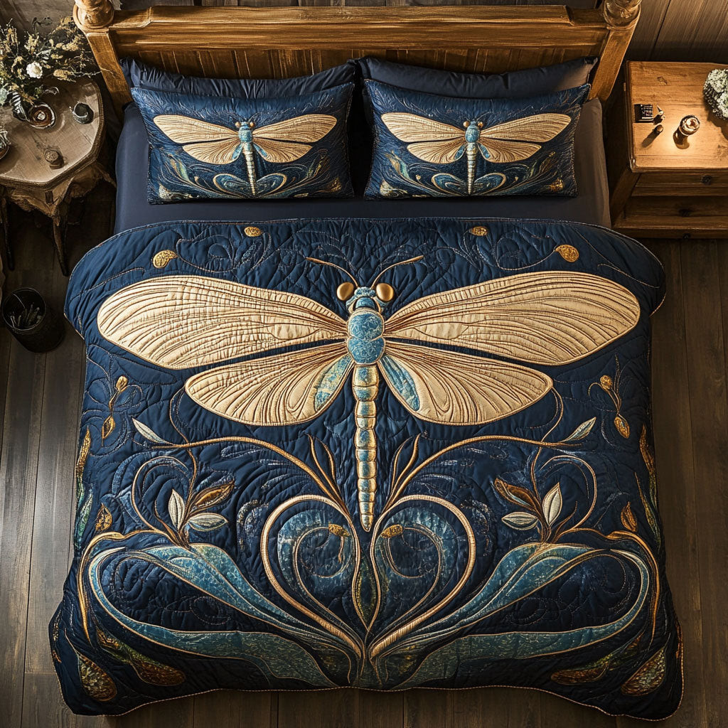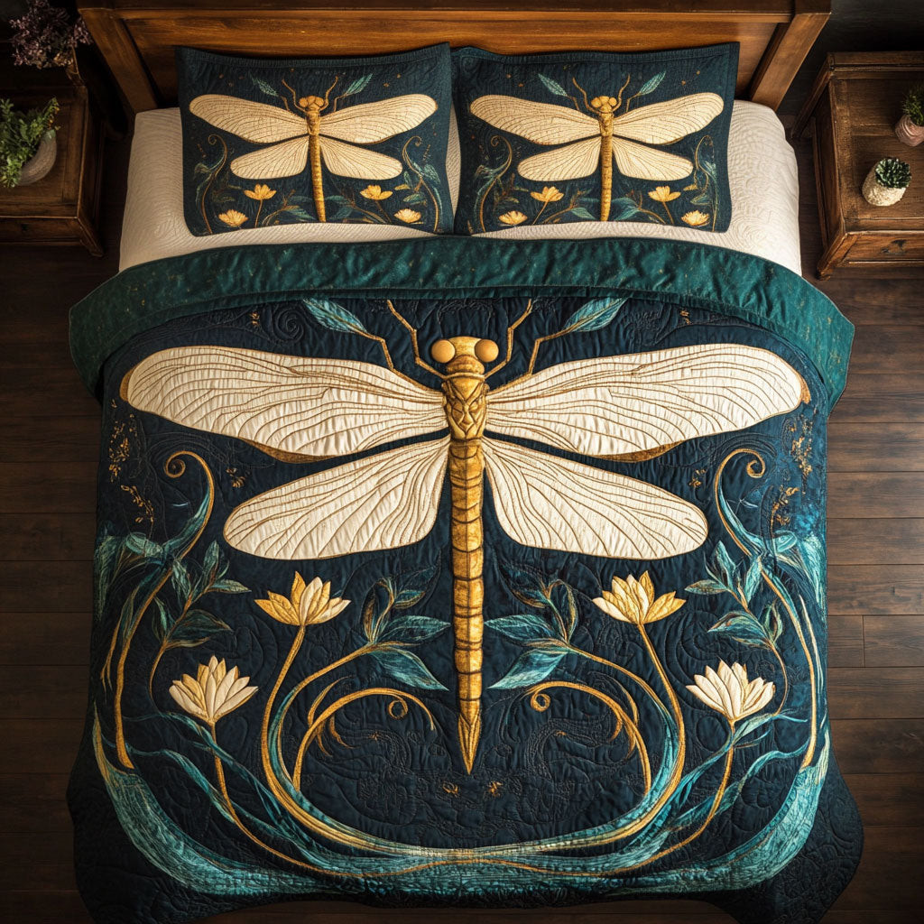 Golden Dragonfly Quilted Bedding Set Full Size Comforter Nature Inspired Gift For Grandma