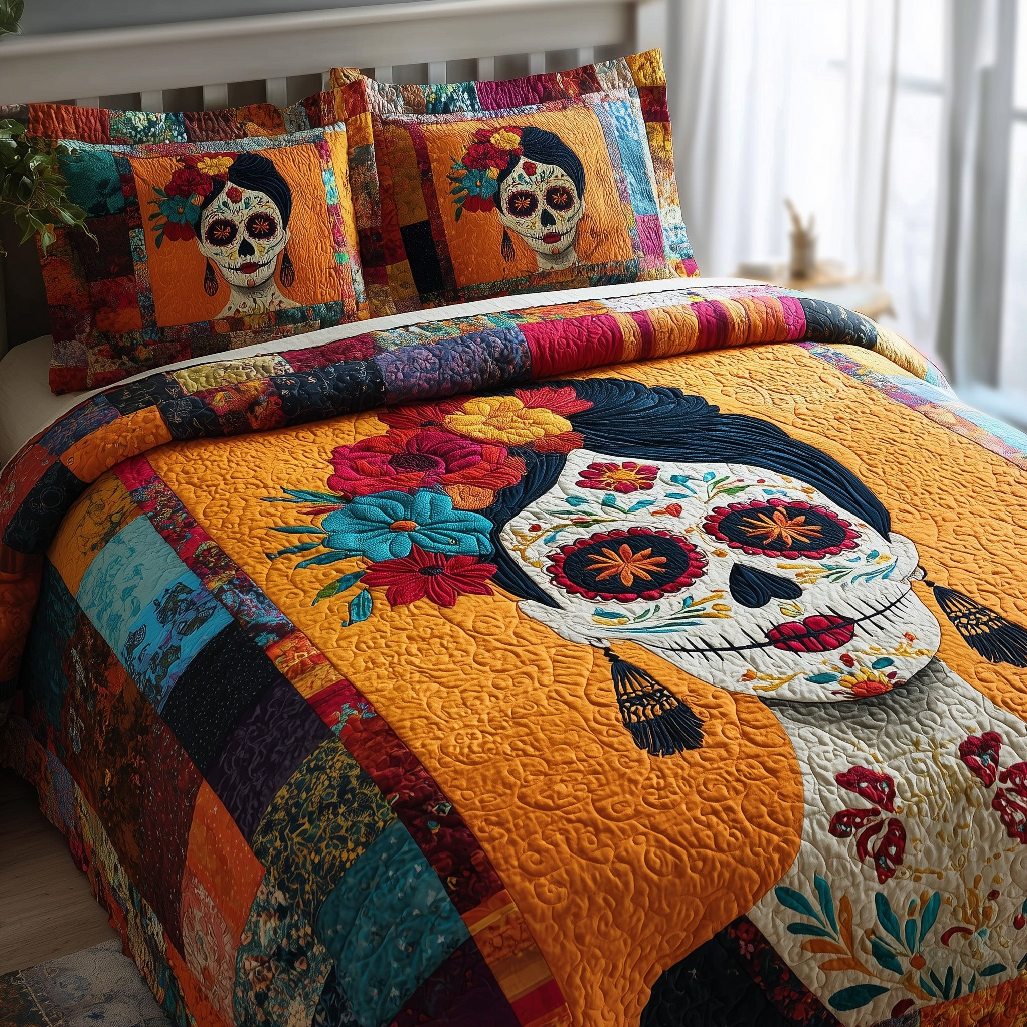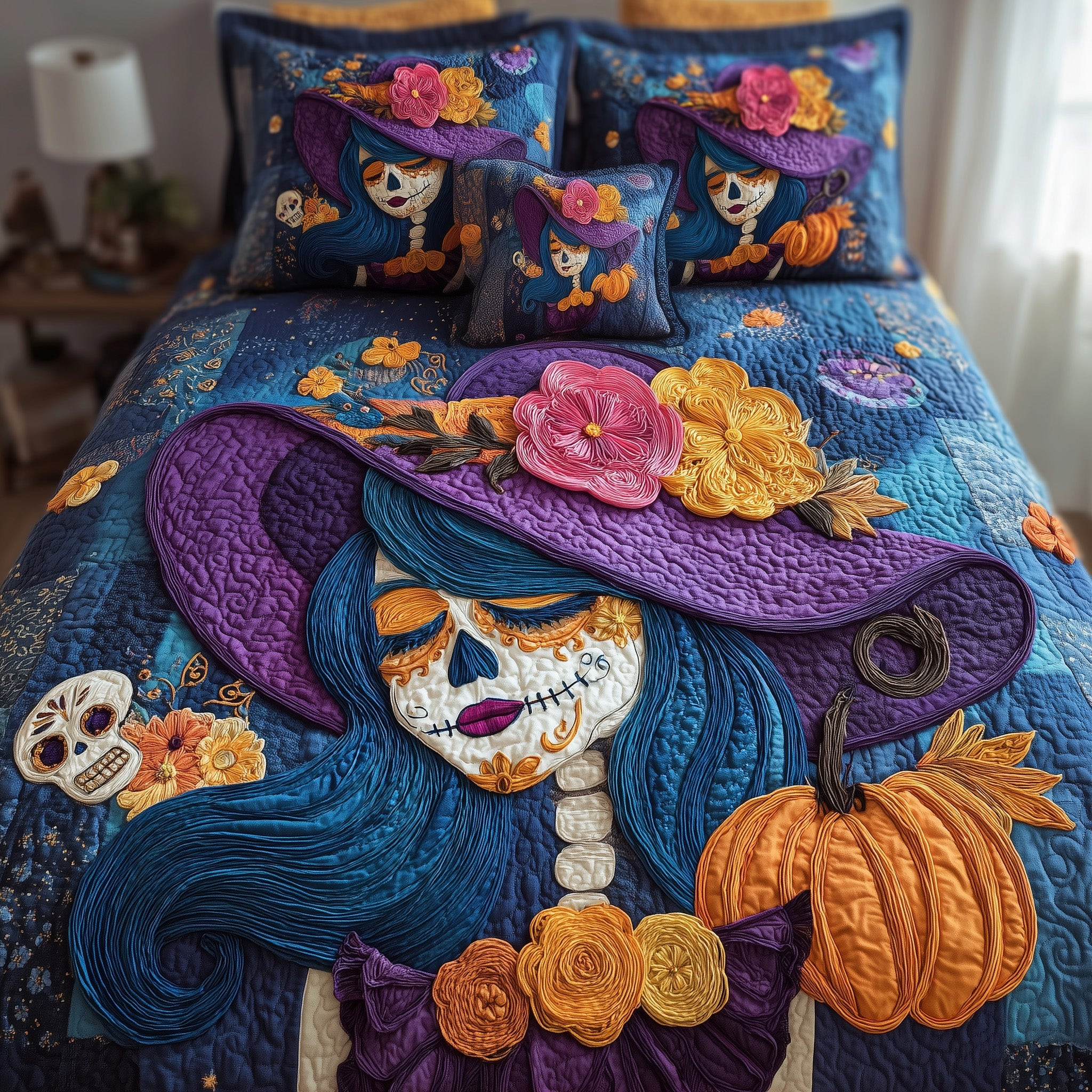 $79.95 – $109.95Price range: $79.95 through $109.95Queen of the Dead Quilted Bedding Set Room Decor Catrina Pumpkin Gift Ideas
