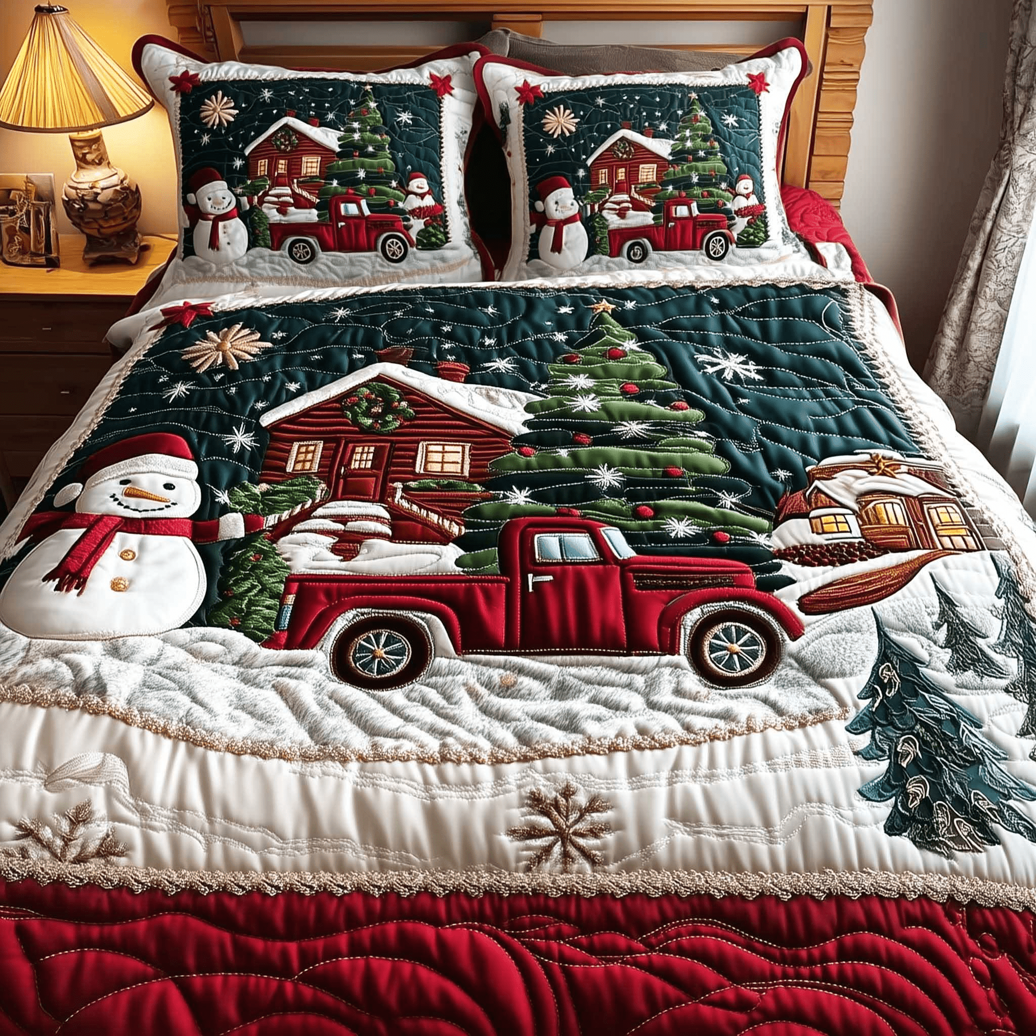 Christmas Farmhouse Quilt Bedding Set Red Truck Bedspreads King Present for Farmers