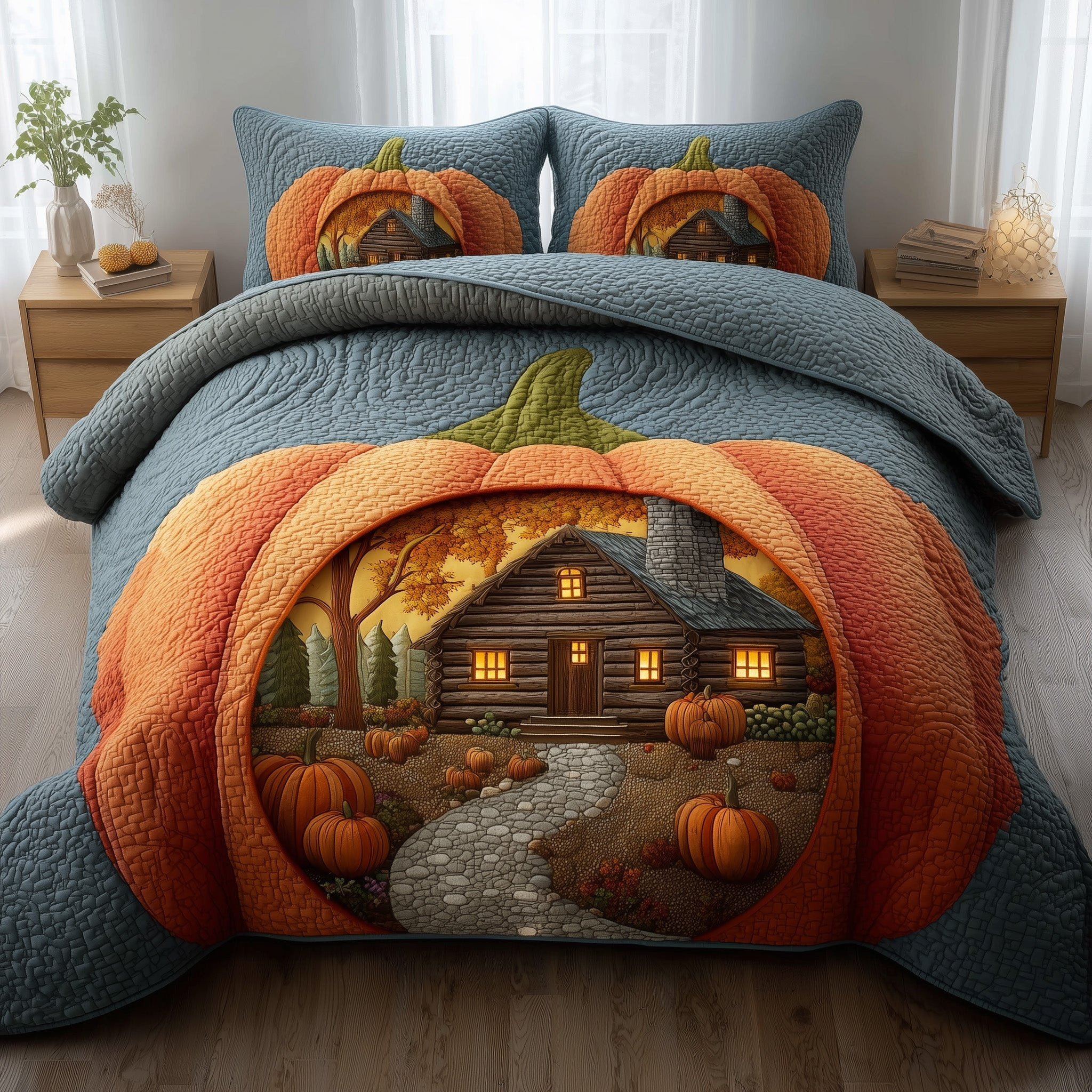 Autumn Cabin Glow Quilted Bedding Set Duvet Cover Log Cabin Pumpkin Autumn Themed Gifts