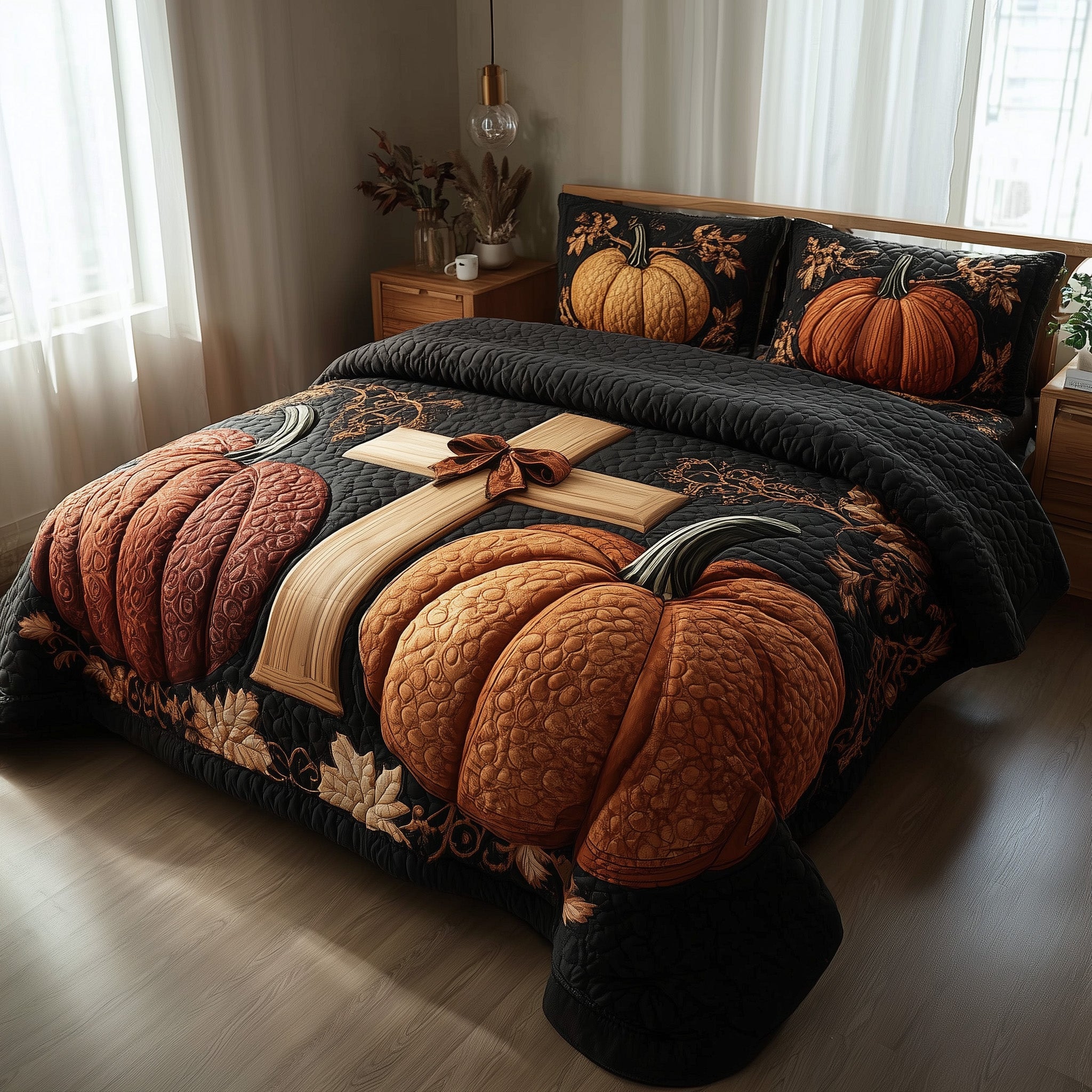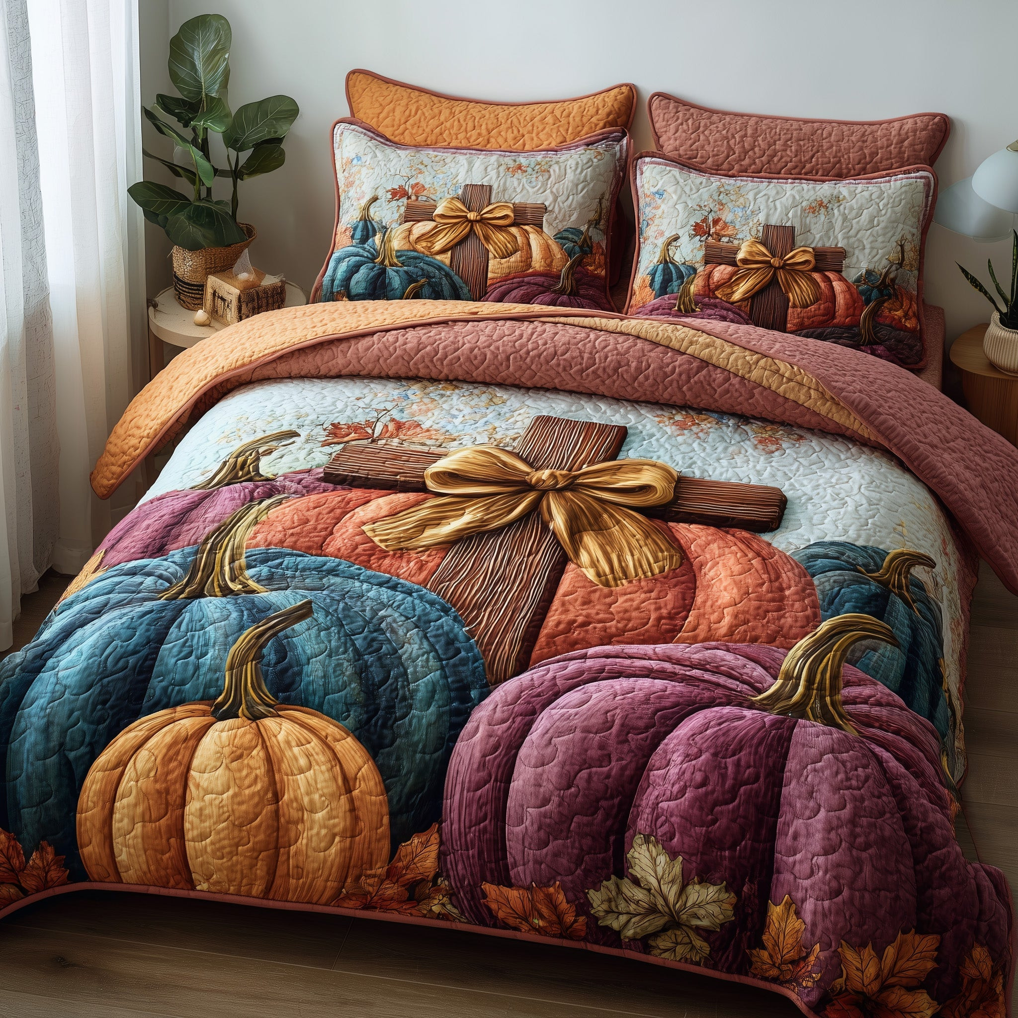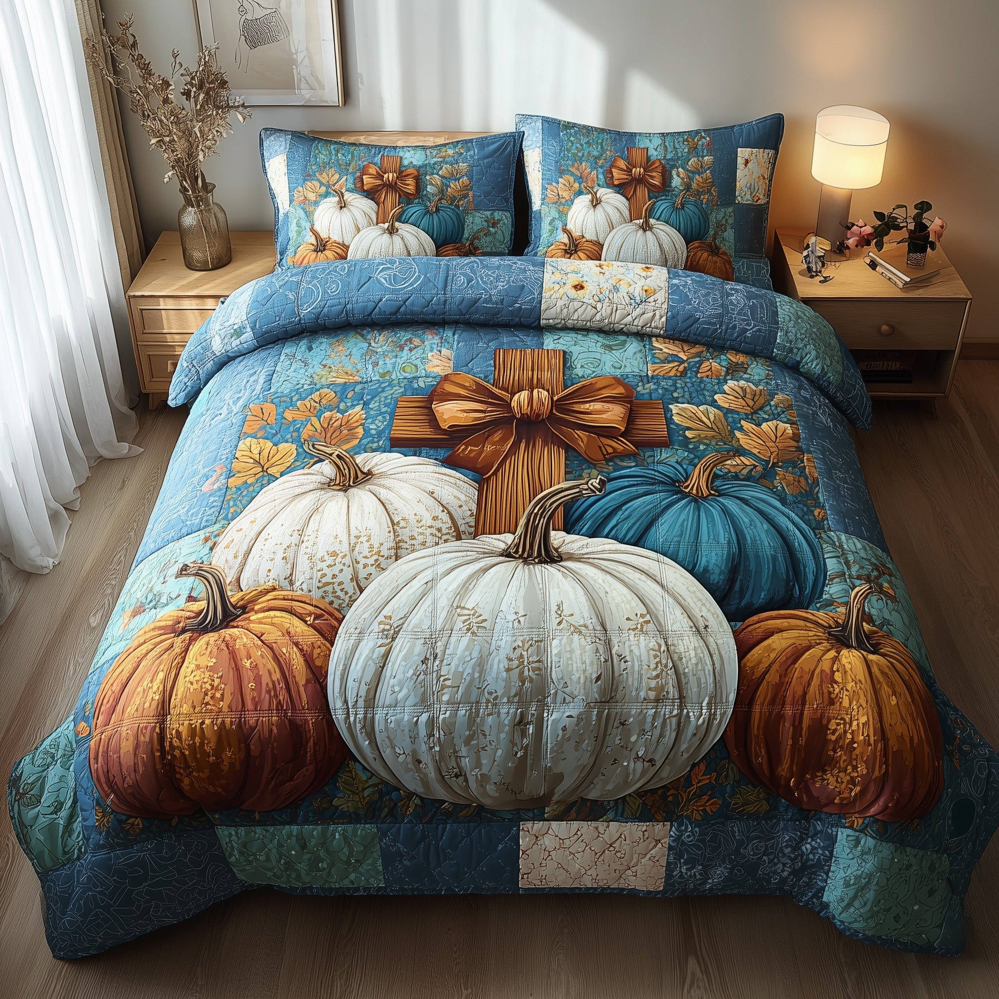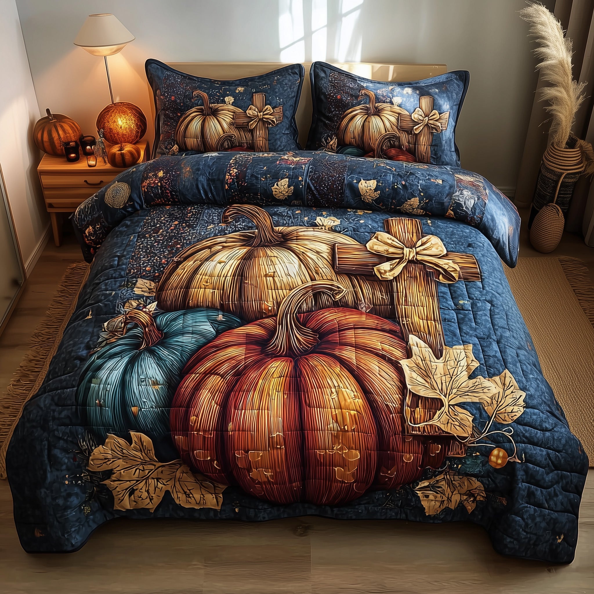 Fall for Jesus Quilted Bedding Set Decoration Pumpkin Cross Christian Gifts For Christmas