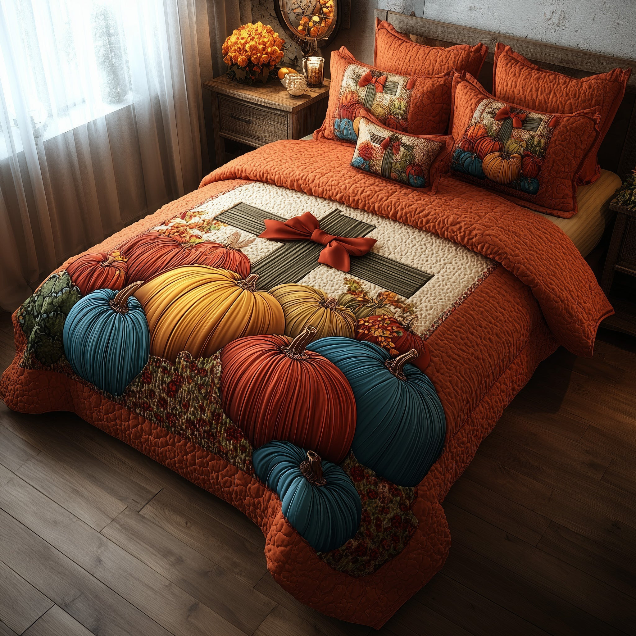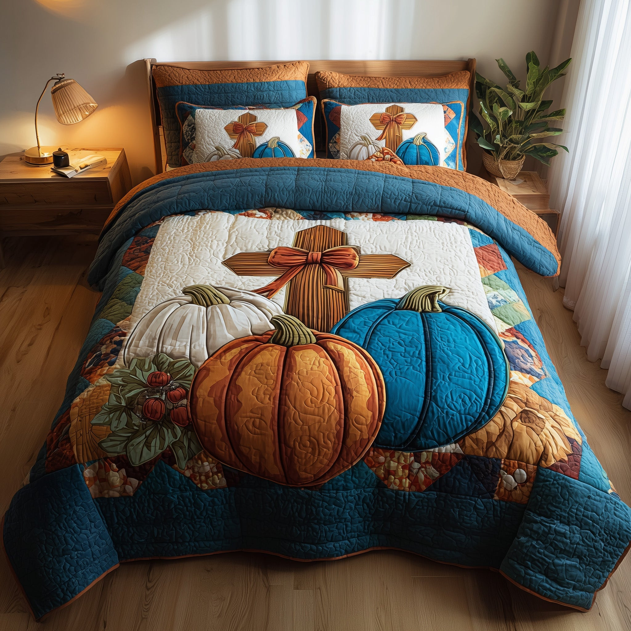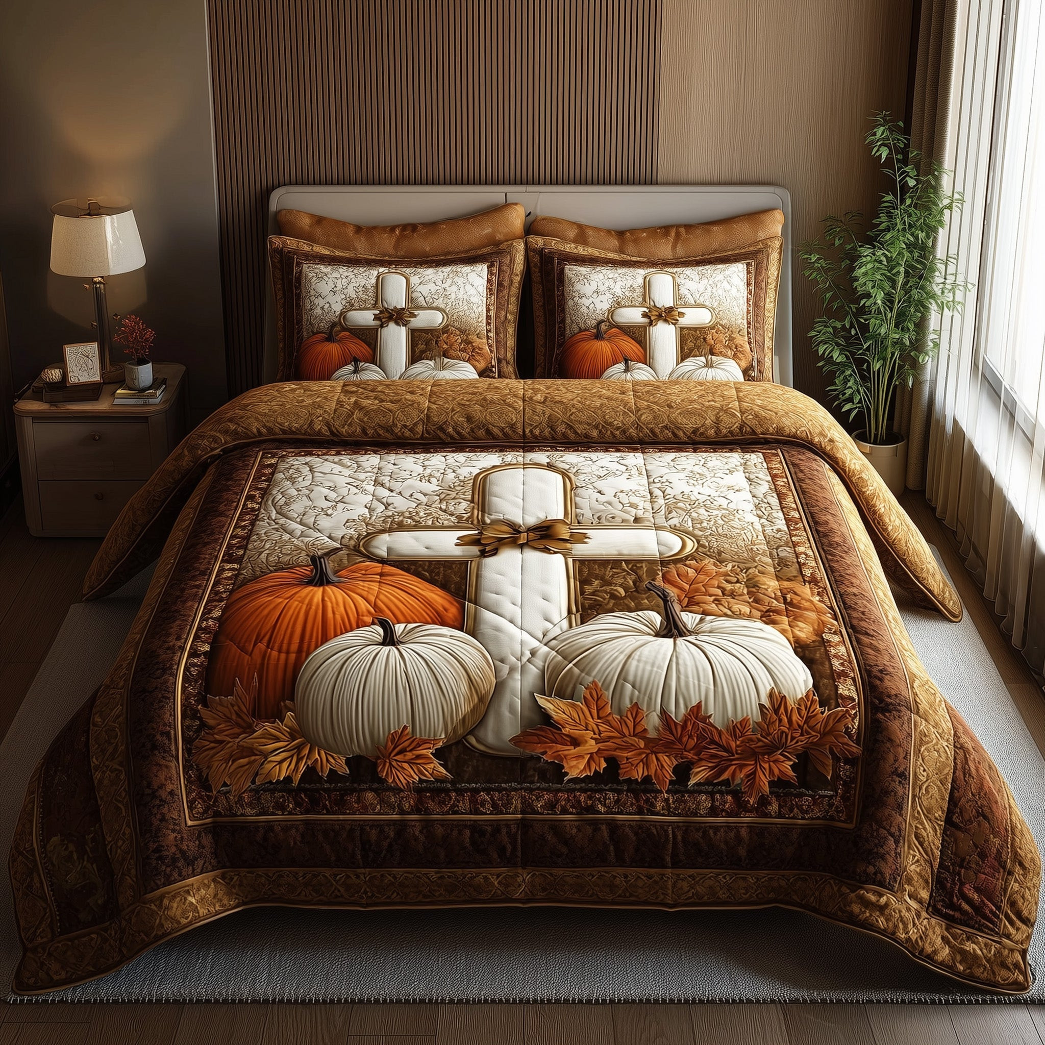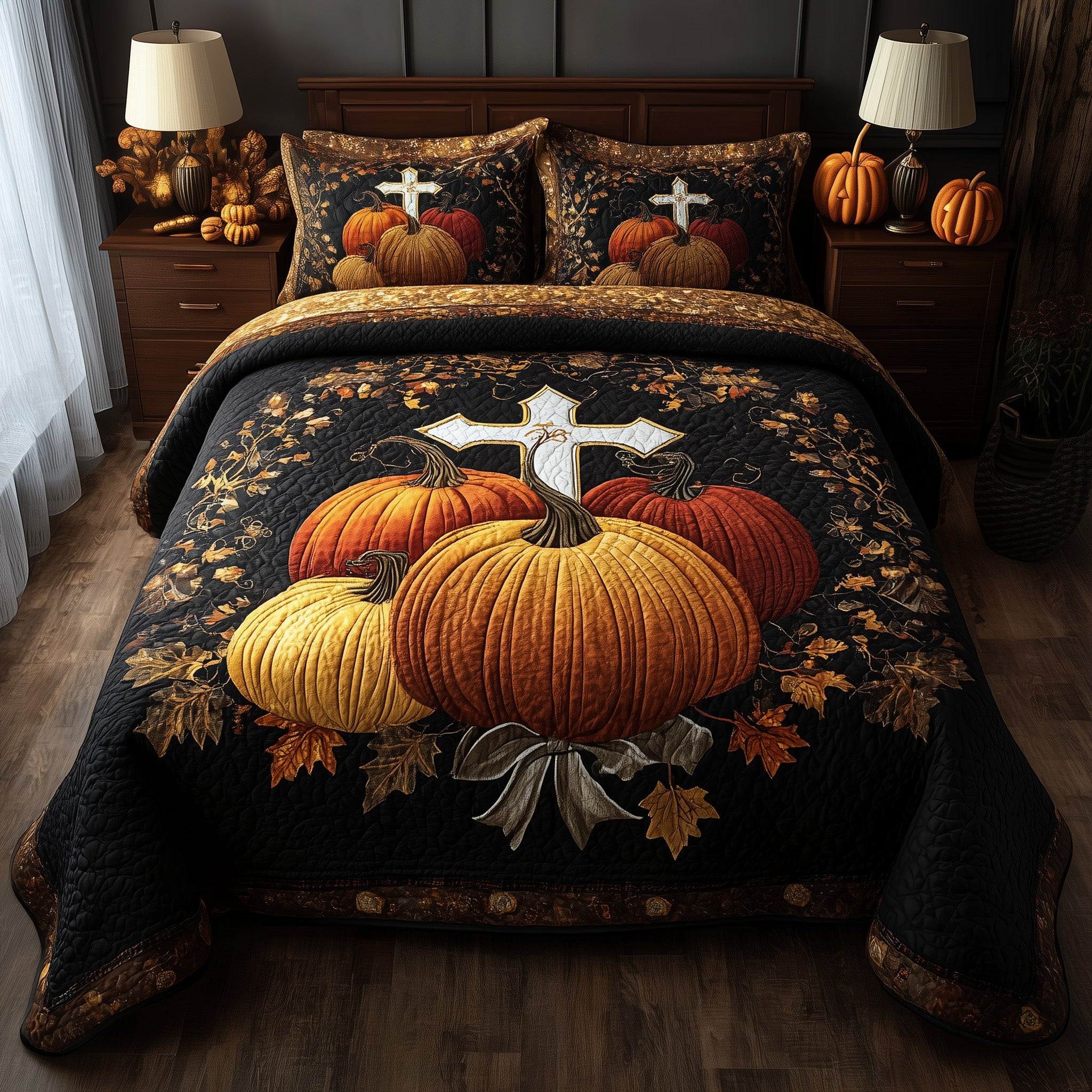 Fall for Jesus Quilted Bedding Set Bedspread Autumn Pumpkin Cross Christian Gift Ideas