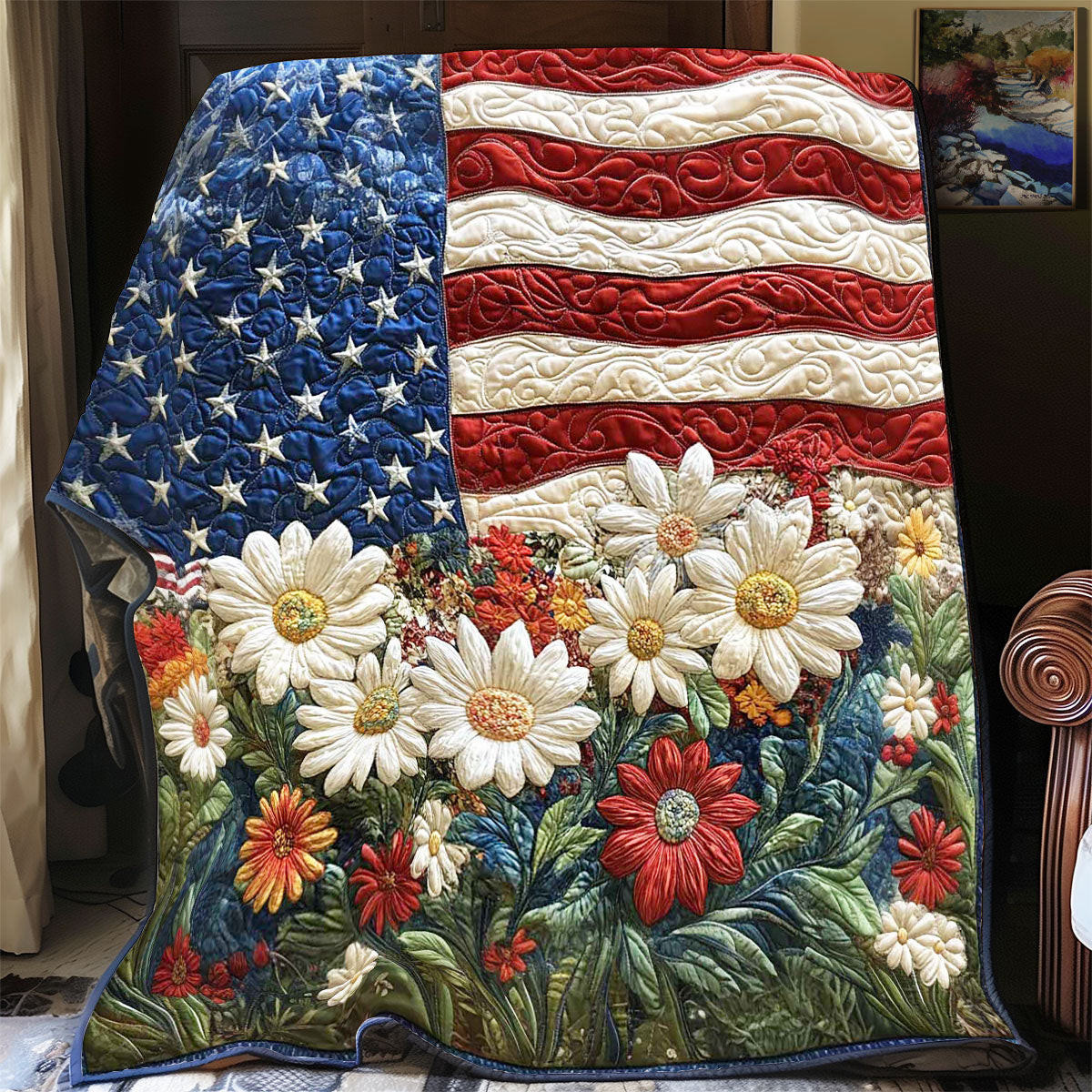 $55.95 – $99.95Price range: $55.95 through $99.95American Daisy Spirit Flower Quilted Blanket USA Flag Veterans Day Recognition Gift Ideas