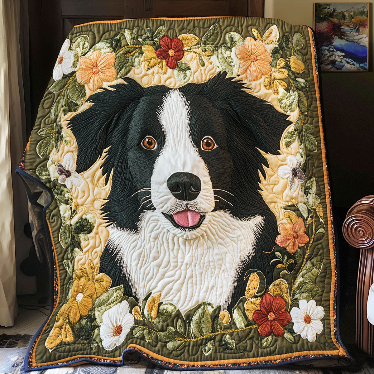 Border Collie Embroidered Blooms Quilt Blanket Comfort Throw Blanket Gifts For Dog Lovers