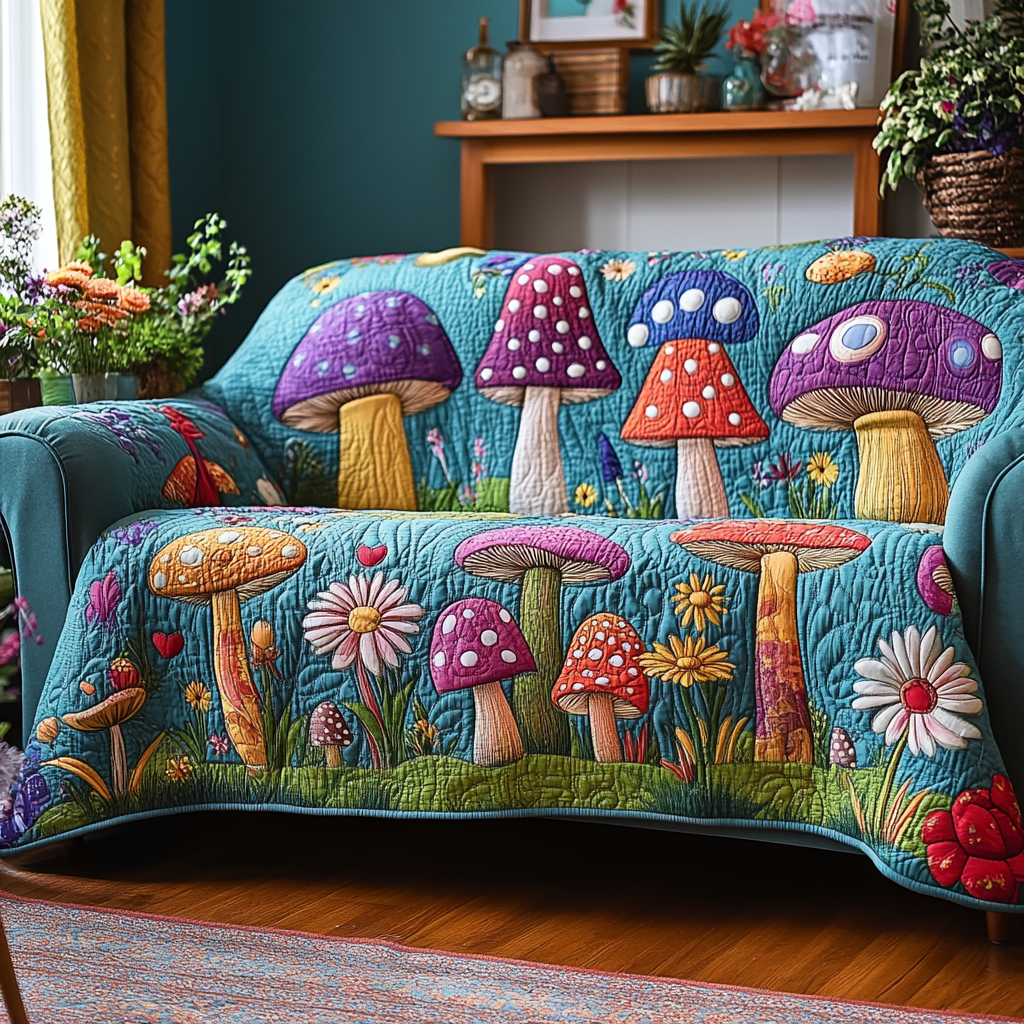 Mushroom Garden Quilted Sofa Cover Bright Color Good Couch Cover Gift For Mushroom Lovers