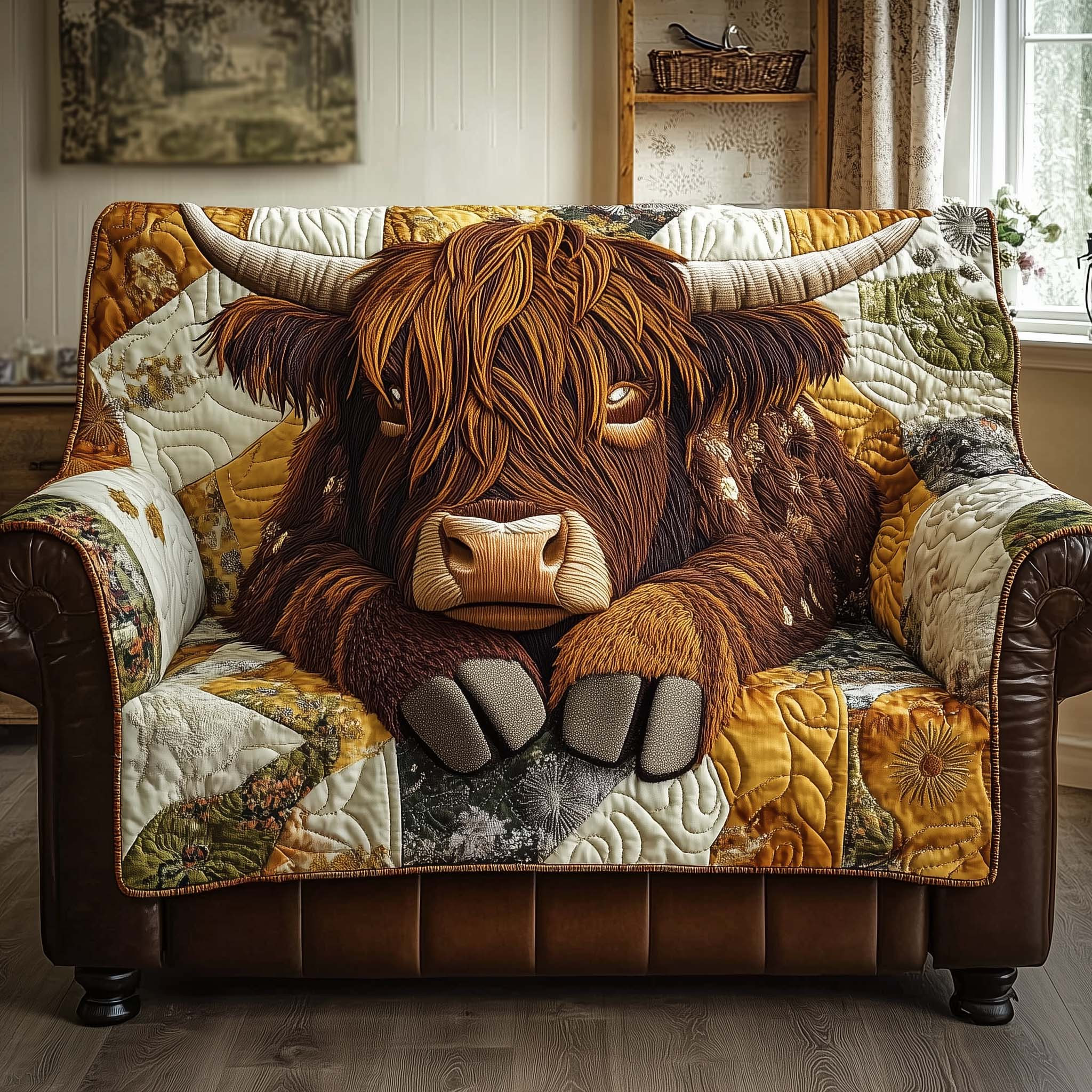 $45.99 – $74.99Price range: $45.99 through $74.99Resting Highland Cow Quilted Sofa Cover Relaxed Highland Bull Cow Lover Gift Ideas