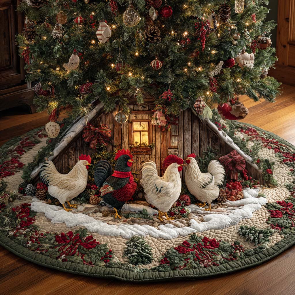 Rustic Chicken Christmas Tree Skirt Quilted Farmhouse Style Holiday Gift for Families