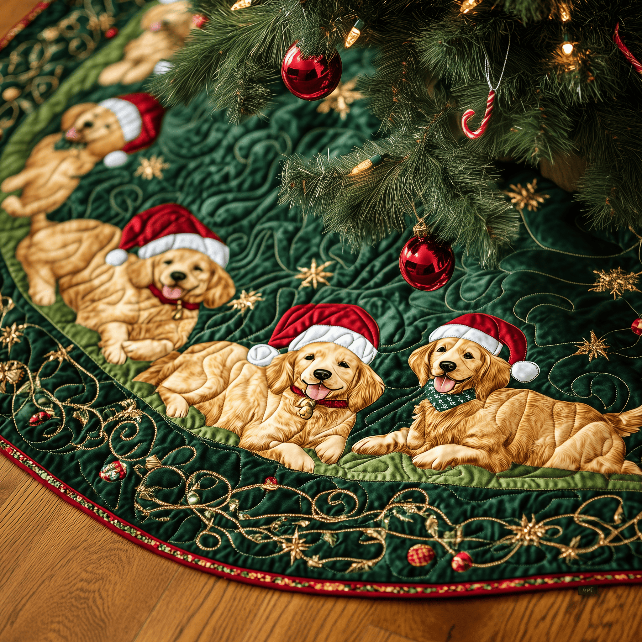 $37.95 – $69.95Price range: $37.95 through $69.95Handmade Quilted Golden Retriever Christmas Tree Skirt Adorable Pet Holiday Decoration Gift