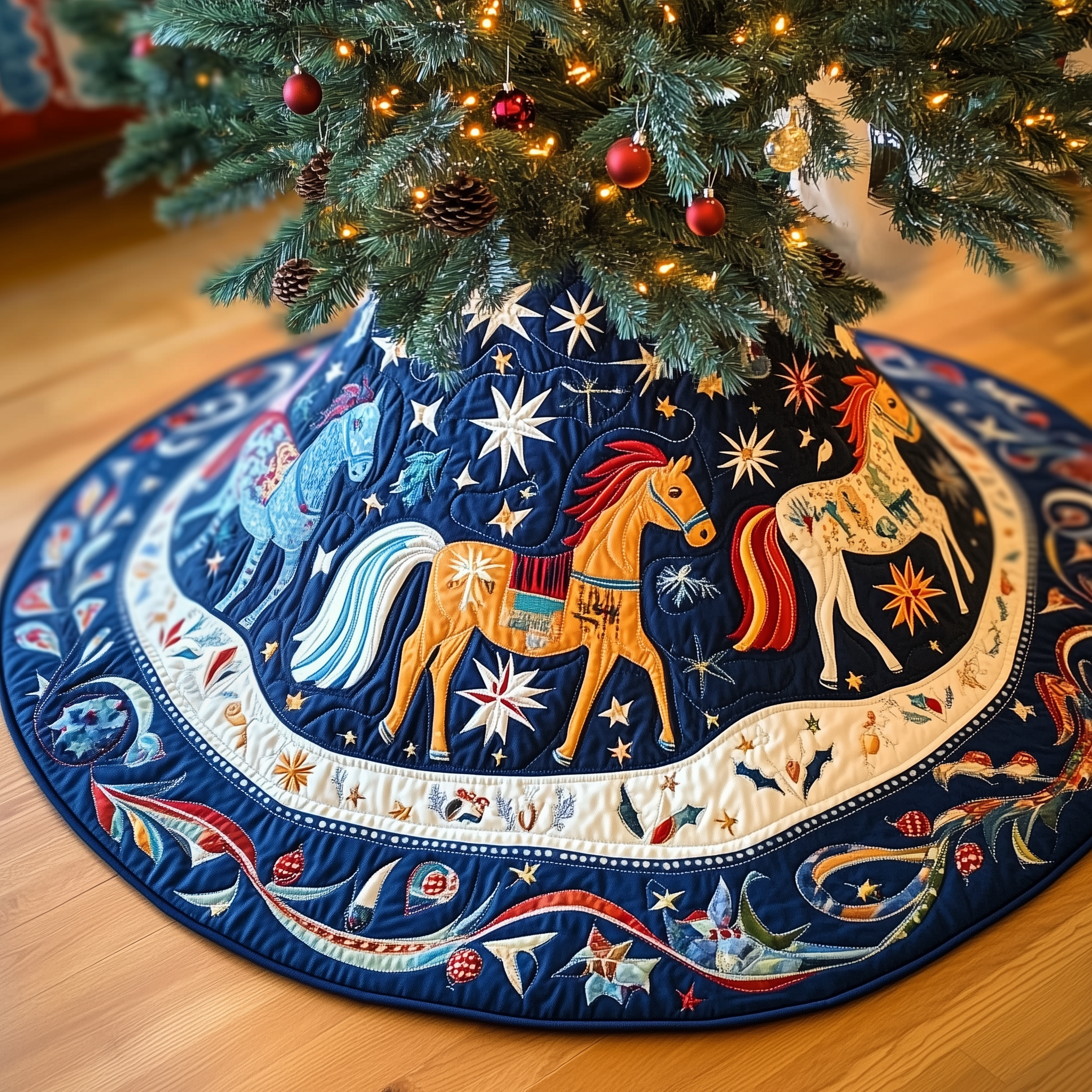 Blue Quilted Horse Christmas Tree Skirt Handmade Holiday Gift for Equestrian Home Decor