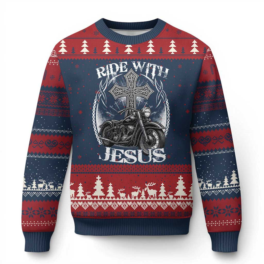 Rushgleam Biker Ride With Jesus Ugly Christmas Sweater Religious Jumpers For Christian