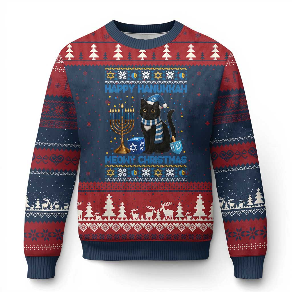 Rushgleam Black Cat Ugly Christmas Sweater Happy Hanukkah Meowy Xmas Cat Lover Gifts
