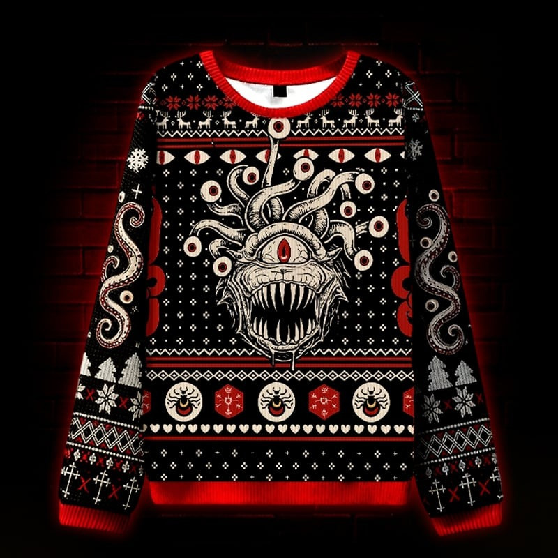 $39.99 – $44.99Price range: $39.99 through $44.99Beholder Dungeons Ugly Christmas Sweater Scary Xmas Clothing Gifts For Friends