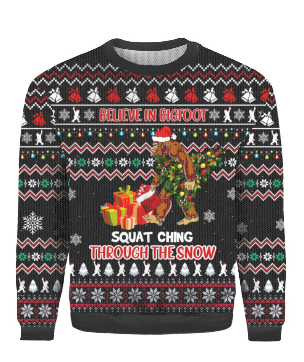 Believe In Bigfoot Ugly Christmas Sweater Squat Ching Through The Snow Bigfoot Gift Items