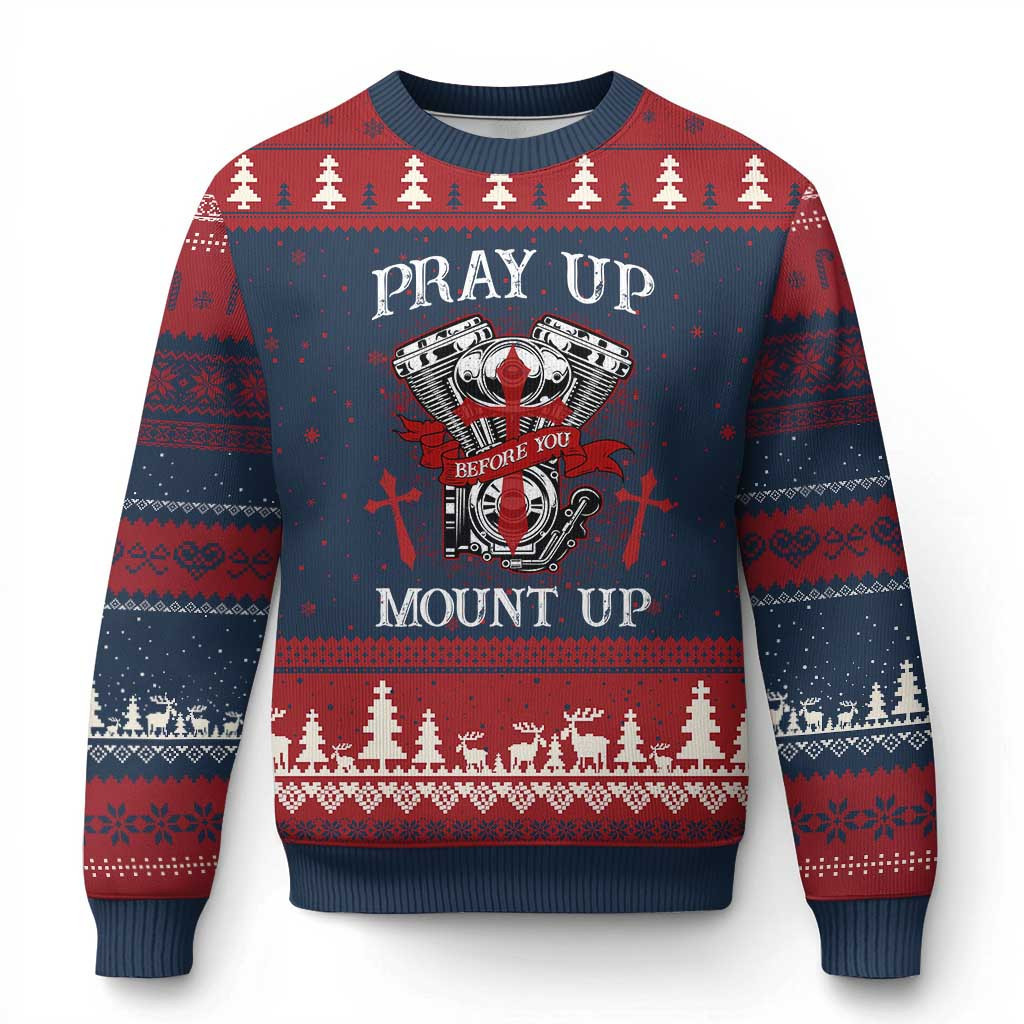 Rushgleam Cross Pray Up Before You Mount Up Ugly Christmas Sweater Faith Gift For Christian Biker