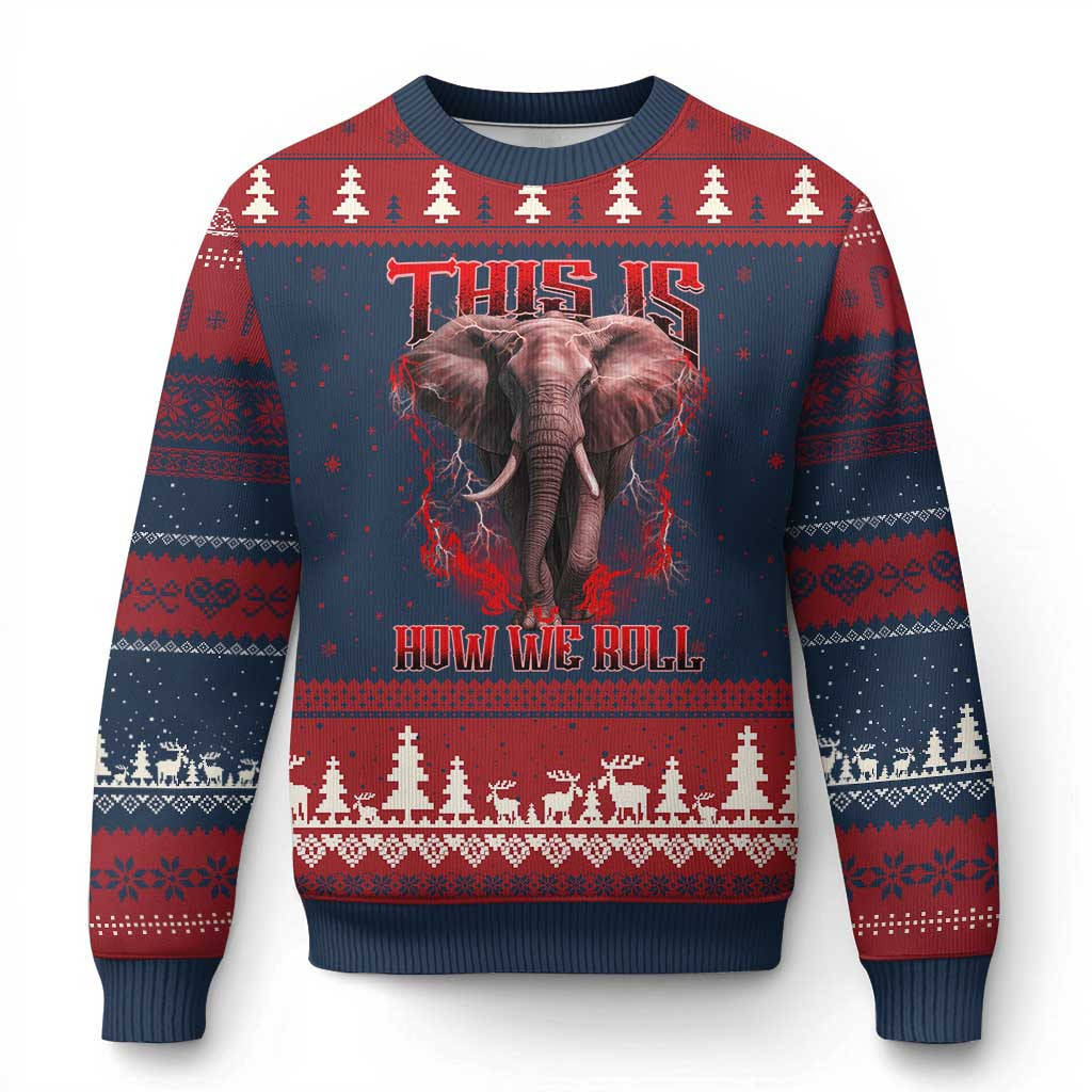 Rushgleam Elephant How We Roll Ugly Christmas Sweater Bama Mascot Game Day Jumper Alabama Fan Gifts