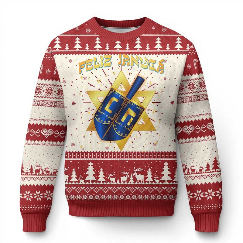 Rushgleam Feliz Januca Jewish Sephardic Ladino Ugly Christmas Sweater Funny Hanukkah Gift For Dad