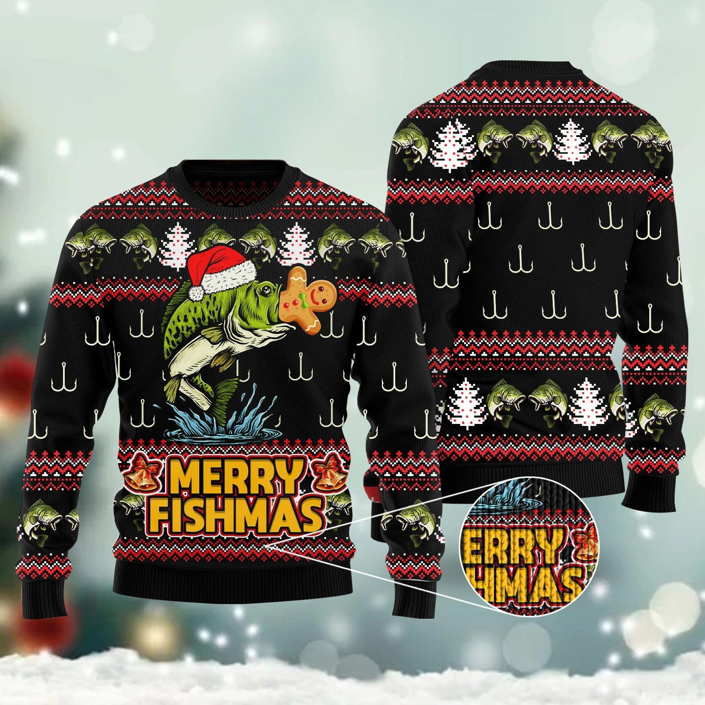 Rushgleam Fish And Gingerbread Merry Fishmas Ugly Christmas Sweater Cozy Gifts For Christmas