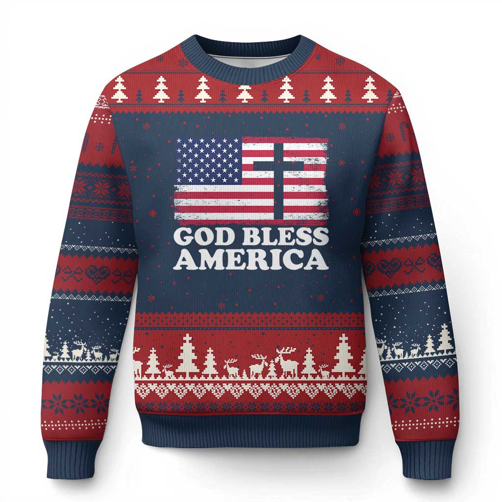 Rushgleam God Bless America Ugly Christmas Sweater Cross USA Flag Patriotic Gift For Christian