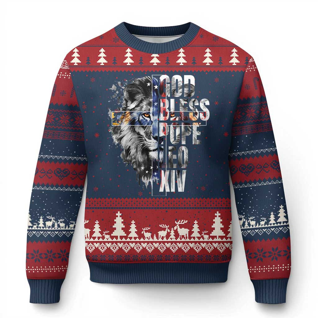 Rushgleam God Bless Pope Leo XIV Ugly Christmas Sweater Lion American Flag Gift For Dad