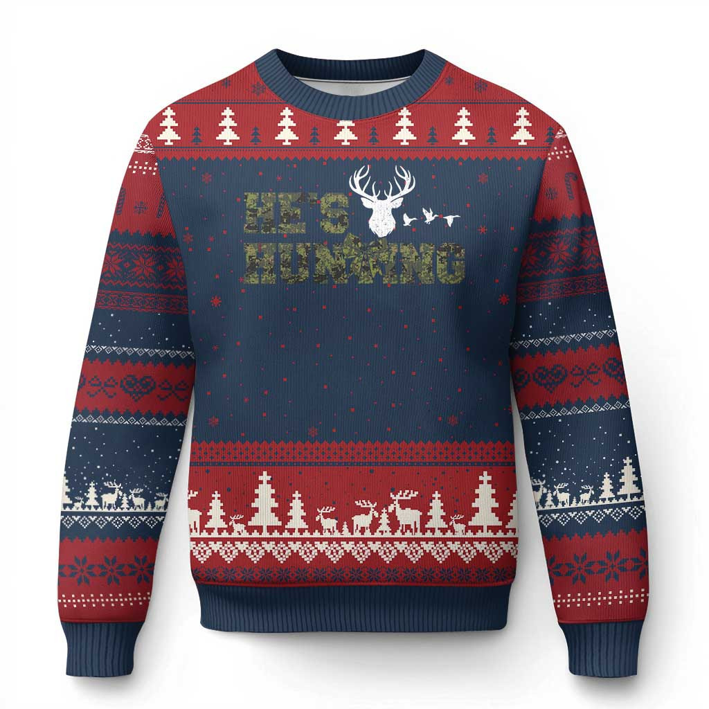 Rushgleam He Is Hunting Ugly Christmas Sweater Camo Deer Hunters Xmas Clothing Gift Ideas