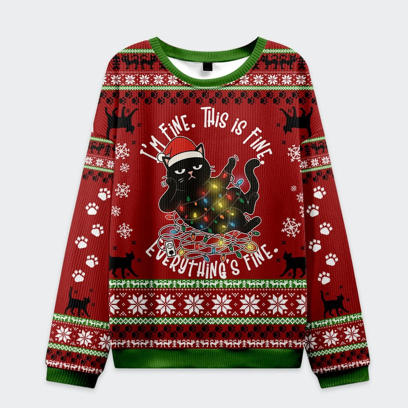 Black Cat I’m Fine This Is Fine Ugly Christmas Sweater Cute Xmas Gifts For Cat Lovers