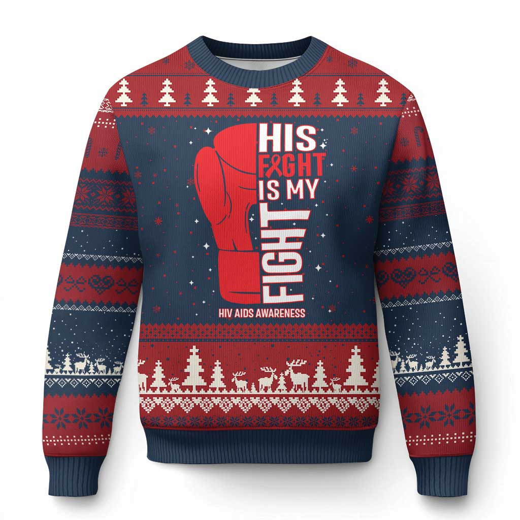 Rushgleam His Fight Is My Fight Ugly Christmas Sweater Red Ribbon HIV Awareness Boxing Gift For Him