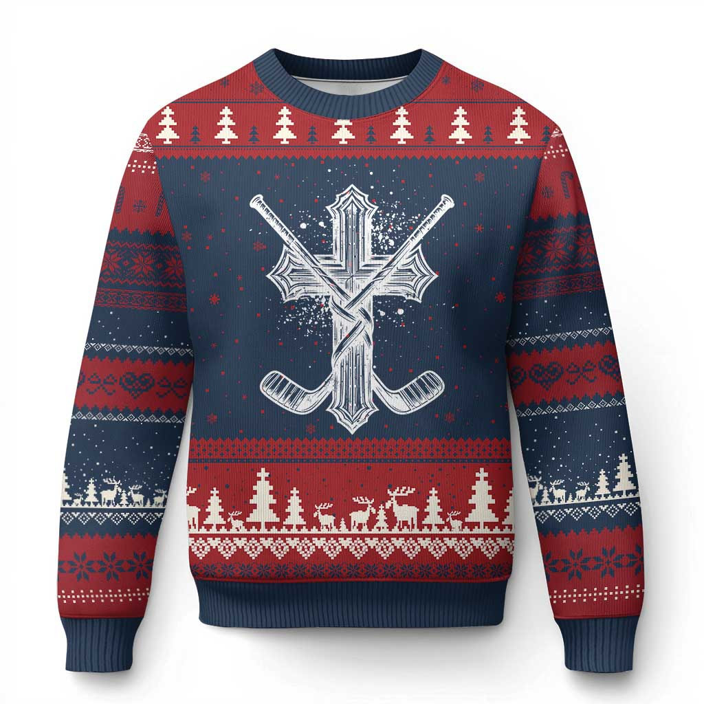 Rushgleam Hockey Cross Ugly Christmas Sweater Religious Ice Hockey Sweater Best Xmas Hockey Gifts