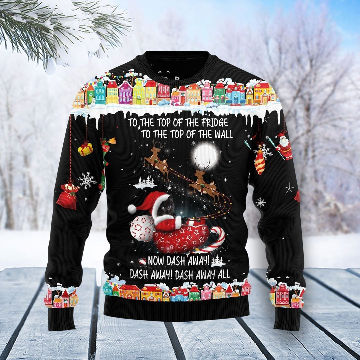 Black Cat On Sleigh Now Dash Away Ugly Christmas Sweater Merch Gift For Black Cat Owners