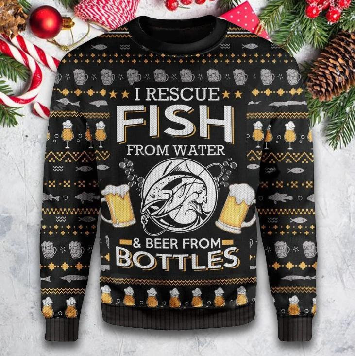 Rushgleam I Rescue Fish From Water Ugly Christmas Sweater Beer From Bottle Xmas Gifts For Beer Lovers