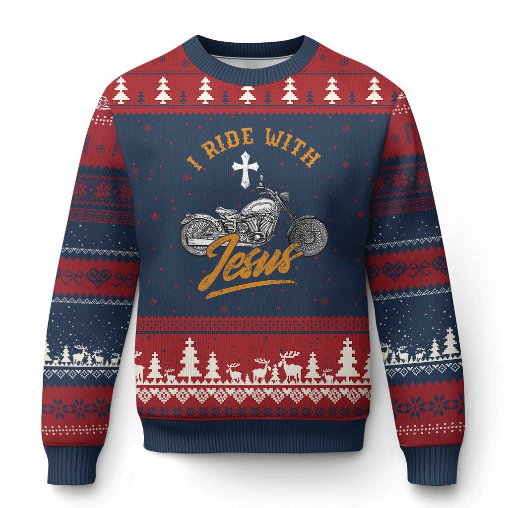 Rushgleam I Ride With Jesus Ugly Christmas Sweater Faith Clothing Gift For Christian Biker
