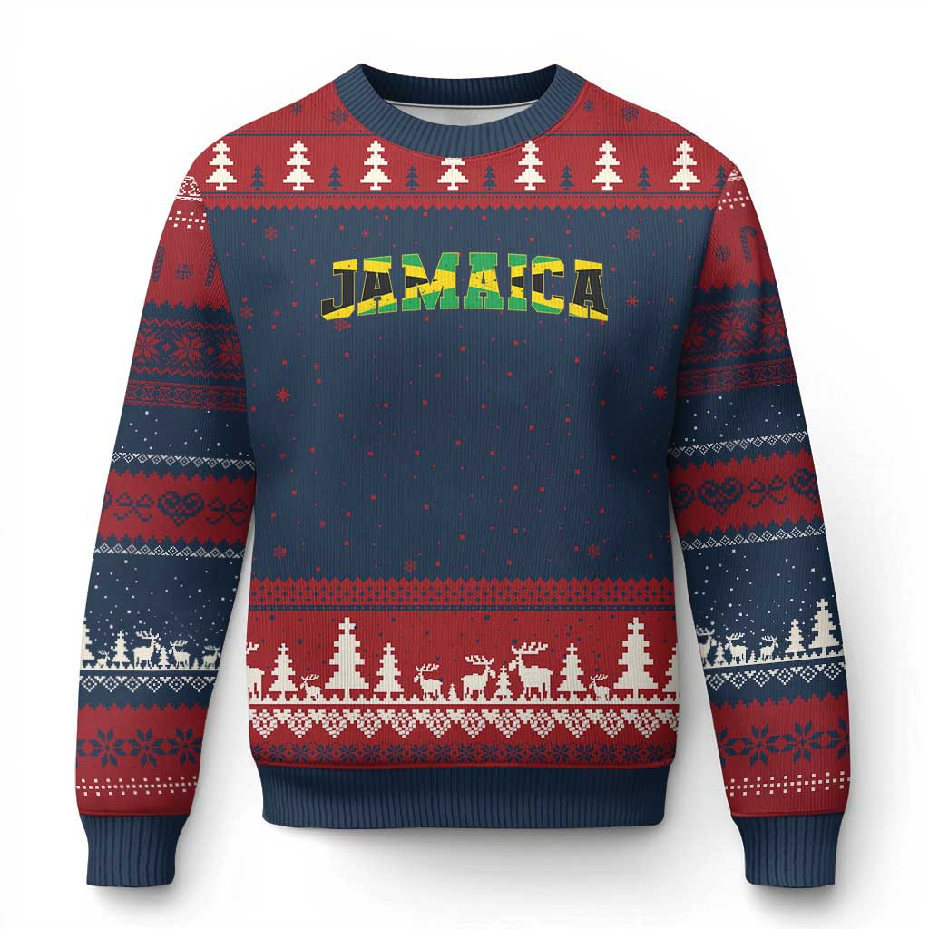 Rushgleam Jamaican Pride Ugly Christmas Sweater Retro Jamaica Flag Distressed Varsity Lettering Style Xmas Sweater