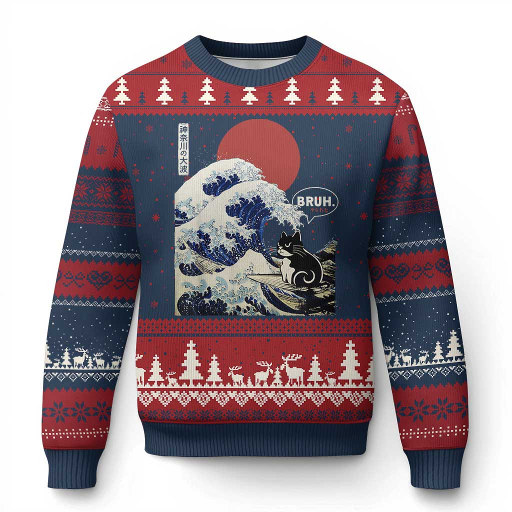 Rushgleam Japanese Kawaii Anime Cat Ugly Christmas Sweater Funny Surfing Cat Bruh Retro Xmas Sweater