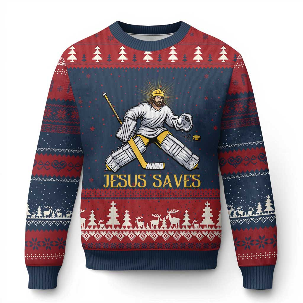 Rushgleam Jesus Saves Ugly Christmas Sweater Funny Christian Ice Hockey Goalie Christmas Sweater